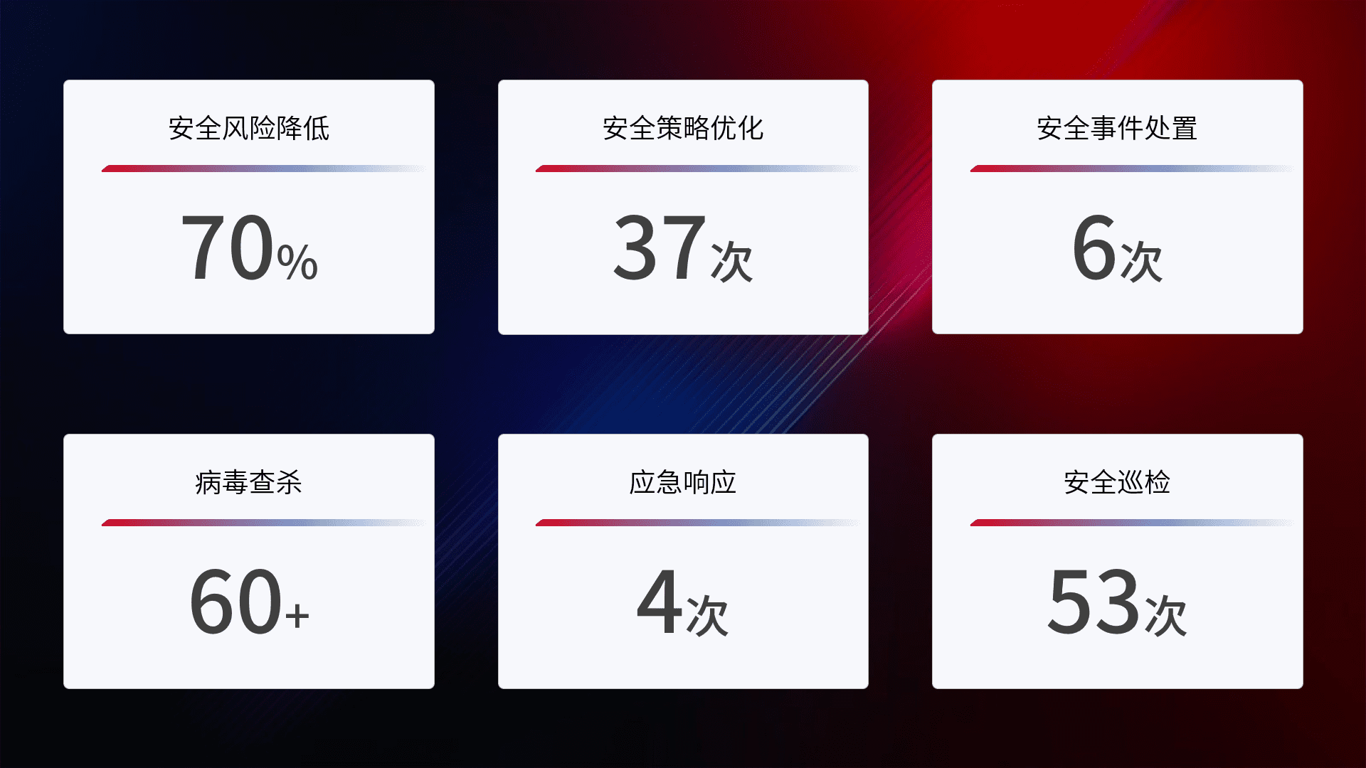提供全面的安全事件报告体系,,,,包括处置报告、、周报、、、、季度和年度总结,,,,结合持续监控,,帮助客户深入了解网络安全状况。。。。